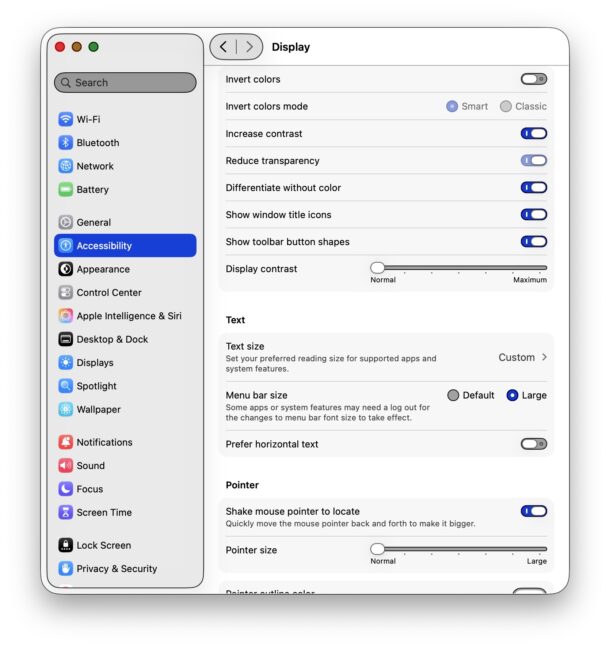 如果上述调整还不够,并且您仍然看到太多阴影、透明度、半透明以及对比度较差的奇怪颜色情况,则另一个可选调整是“增加对比度”。尝试“系统设置”>“辅助功能”>“显示”> 中的“增加对比度”设置,以进一步减少液态玻璃的外观。但是,正如您将看到的,此设置相当引人注目,它可以使 macOS 看起来如此不寻常,有点像少年的线条画,以至于许多 Mac 用户根本不想使用该设置。理想情况下,“增加对比度”设置将是一个可调节的滑动比例,您可以增加或减少其强度,但这可能是一厢情愿的想法。