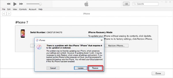步骤 3.一旦 iPhone 进入恢复模式,iTunes 会弹出一个对话框,告知 iPhone 出现问题,需要更新或恢复。在这里,单击“恢复”选项。
