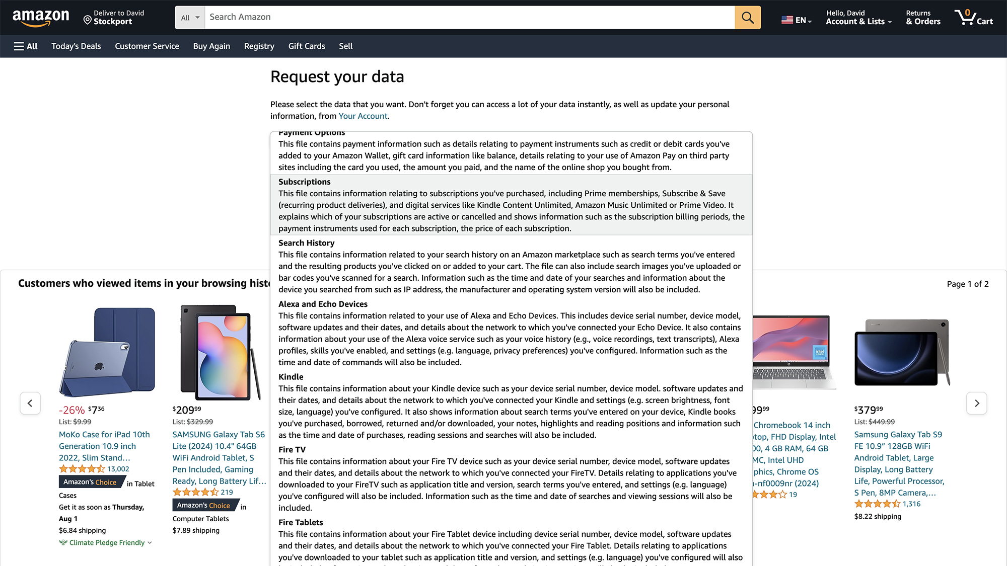 登录您的帐户,悬停帐户和列表(右上),然后选择您的帐户。在下一个屏幕上,您应该看到一个链接请求您的数据:您可以选择数据类型(例如搜索历史记录), 或者请求所有数据。
