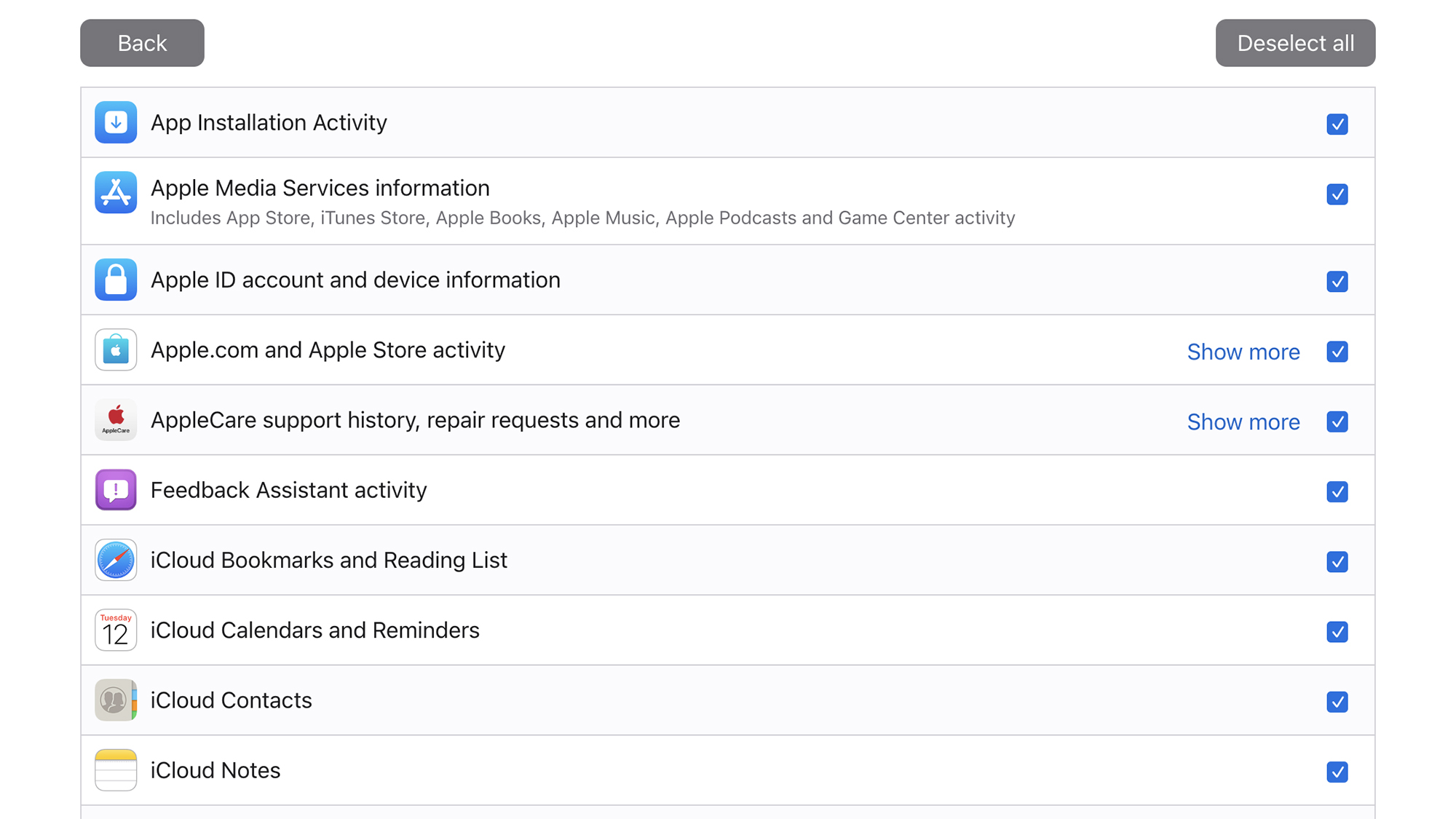 苹果有一个特定的数据和隐私网站您可以使用Apple ID登录。进入后,请单击请求您的数据副本链接,然后选择所需的数据类型(或选择呈现给您的所有类别)。