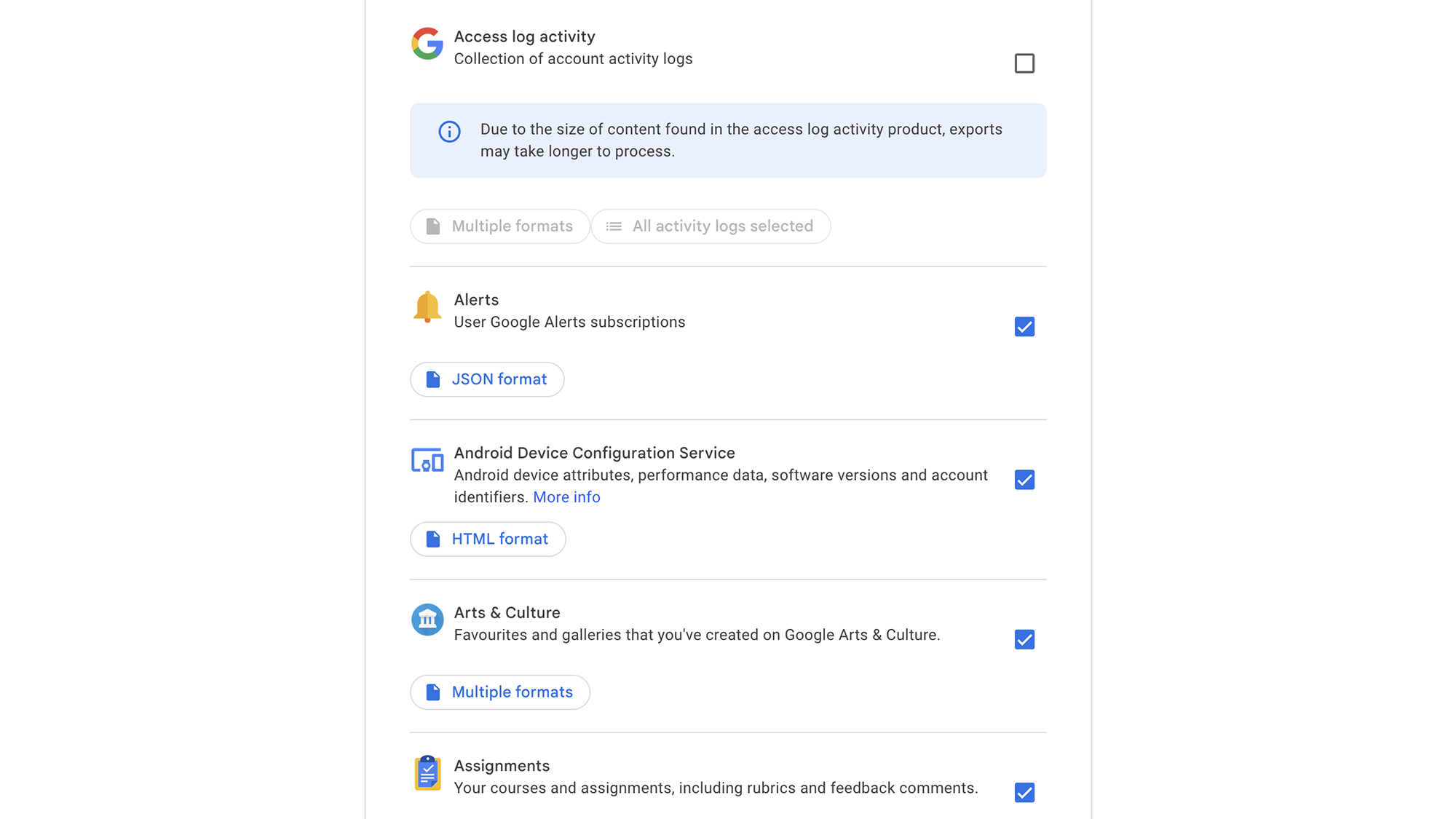 选择一些或全部数据,然后下一步,并遵循有关您想要传递数据的格式的说明。Google表示,根据您选择的内容,最终确定导出并将其交付到收件箱中可能需要“小时或几天”。