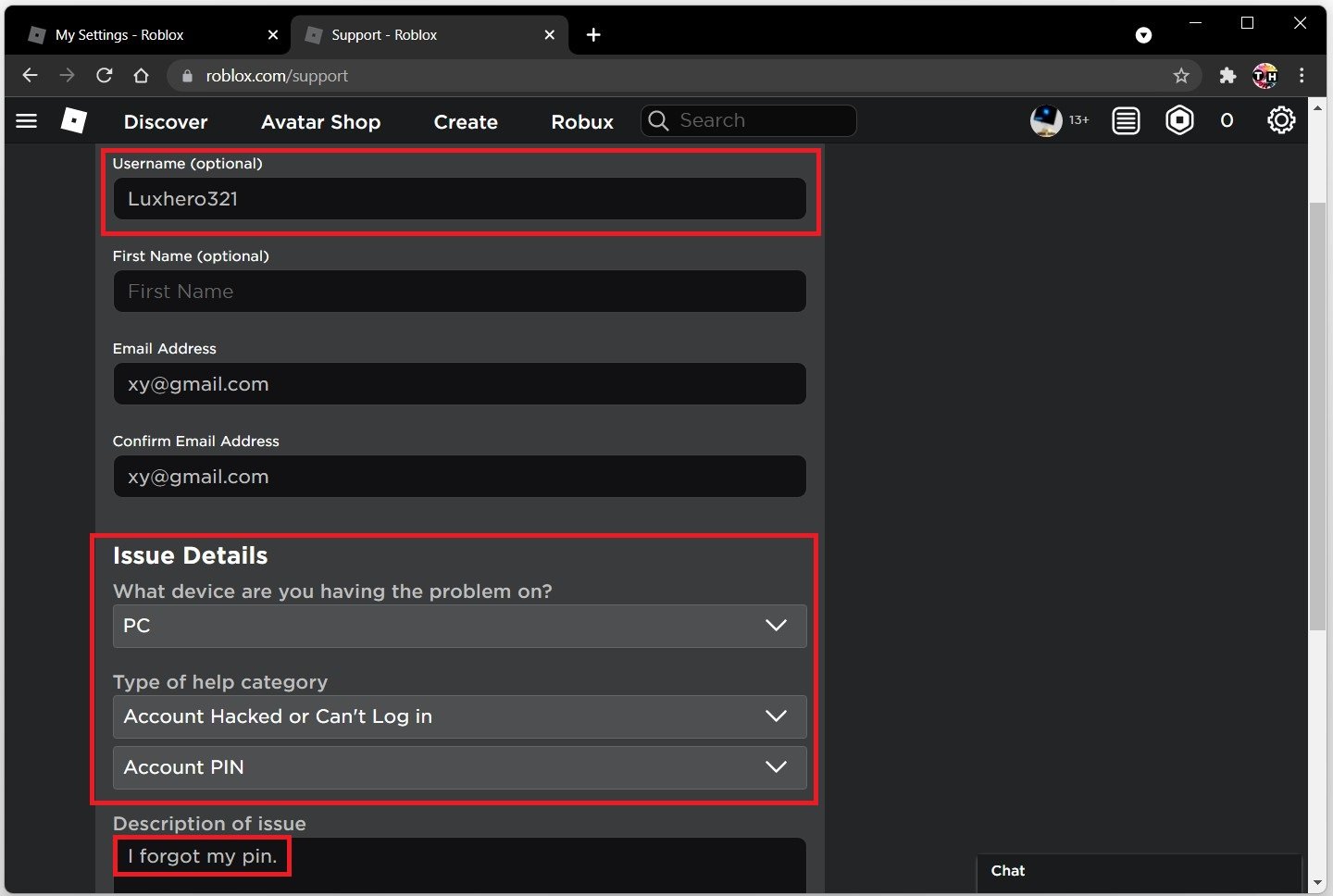如果您不记得自己的 PIN 码,或者感觉有人侵入了您的帐户并更改了它,有一种常见的方法可以联系支持人员并要求他们在不知情的情况下完全删除 PIN 码。为此,请导航至roblox.com/support。您的 Roblox 用户名应该会自动插入。在下面添加与您的 Roblox 帐户关联的电子邮件地址,并确认该地址以确保 Roblox 支持人员可以与您联系。