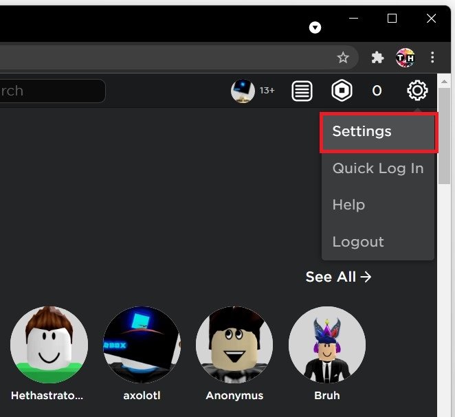 根据您的喜好,在 PC 或移动设备上使用您最喜欢的浏览器登录您的 Roblox 帐户。单击右上角的齿轮图标并选择设置。