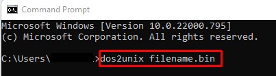 步骤2:然后,输入以下命令”dos2unix 文件名.bin ”