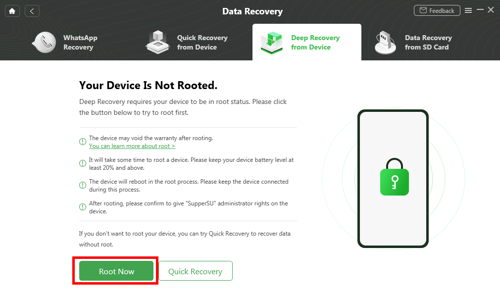 步骤 4。如果您的三星设备未root,请单击“立即root”按钮。 root 过程完成后,DroidKit 将开始扫描三星手机上的所有通话记录。
