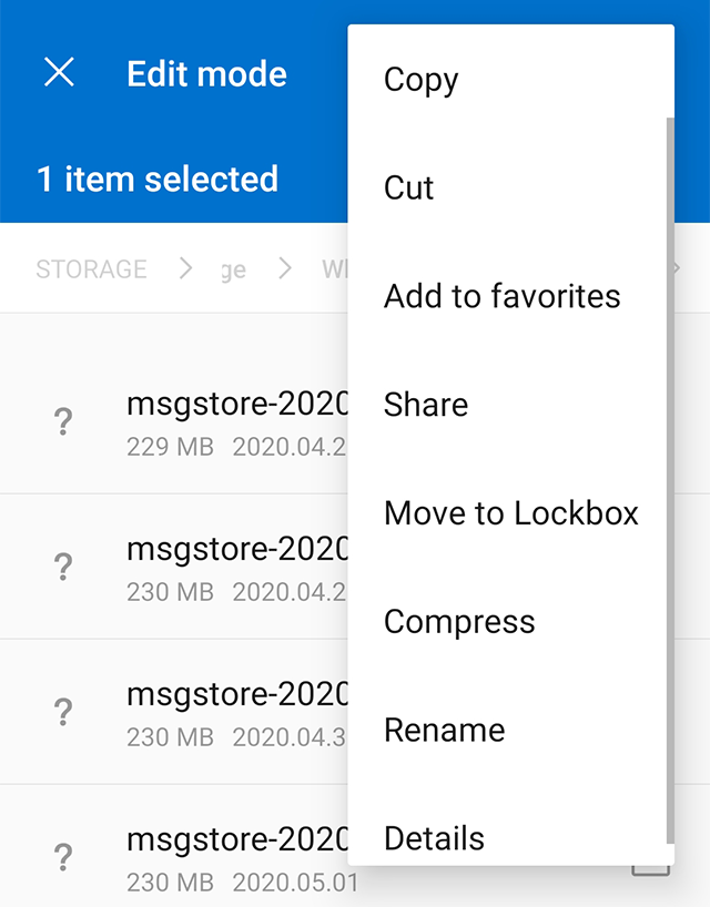 步骤 4. 在手机上找到您想要恢复的备份。点击并按住备份文件,点击右上角的三个点,然后选择“重命名”。使用 msgstore.db.crypt12 作为文件名。