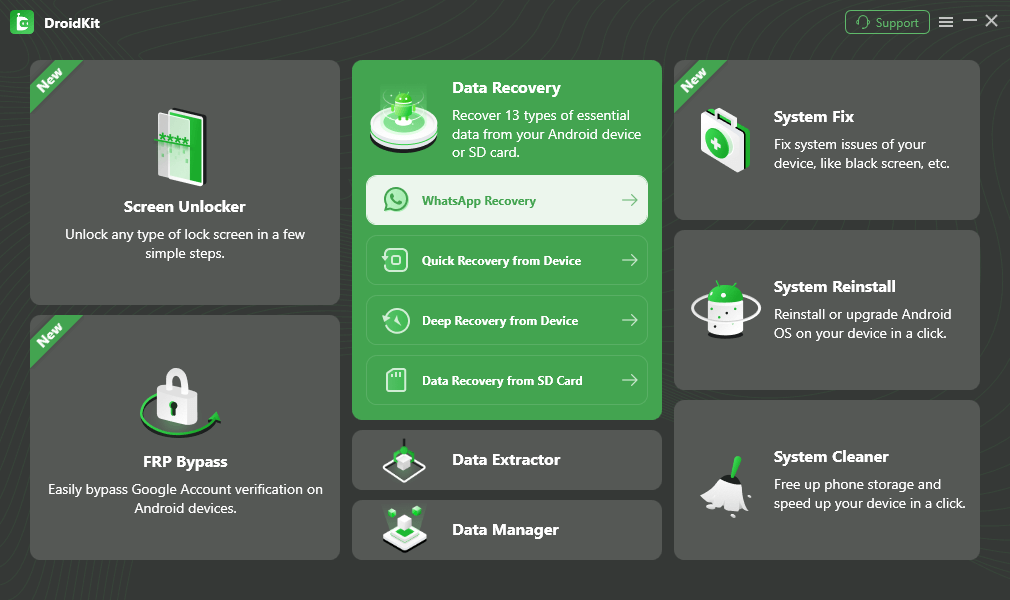 1. 在 Mac 或 Windows PC 上获取 DroidKit。启动它并转到数据恢复模式 并选择WhatsApp 恢复选项。