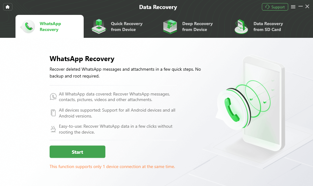 机器人套件是一个管理Android的综合工具。经过专家团队的研究,它能够以最安全、最快的方式恢复 WhatsApp 数据。以下是其主要特点: