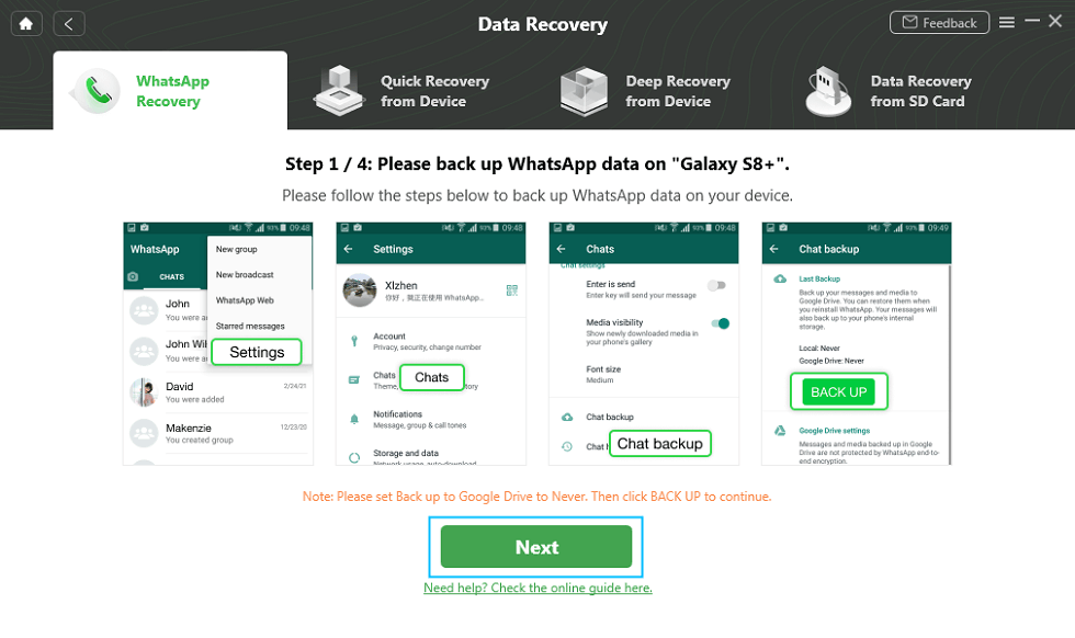 按照屏幕上的说明准备 WhatsApp 恢复设置。准备工作完成后,单击下一个按钮。