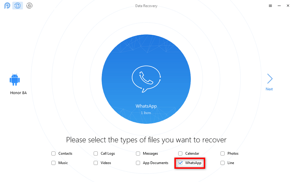 步骤 3. 在接下来的屏幕上,它将询问您要恢复的内容类型。选择WhatsApp并点击下一个。