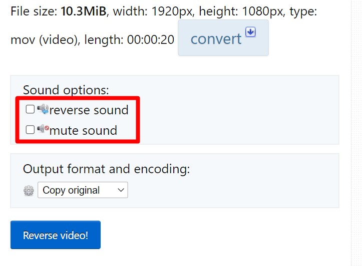 - 向下滚动,您可以选择一些声音选项。通过选择“反转声音”,您可以反转声音,使其与视频反转配合良好。您还可以将声音静音。