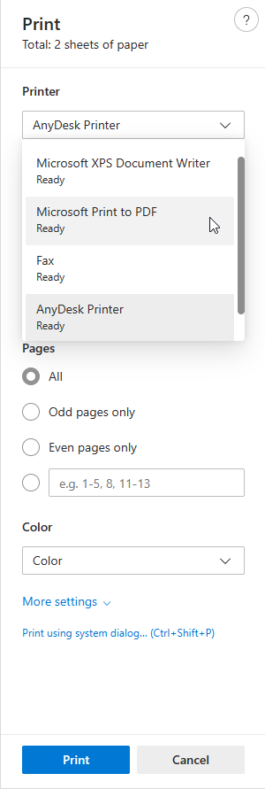 如果您在“打印机”下使用 Edge,请选择“Microsoft 打印到 PDF”