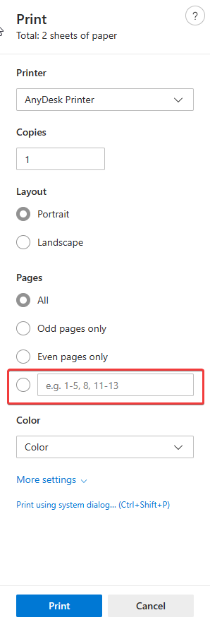 边缘用户需要选择页面范围旁边的单选按钮并提及页码。