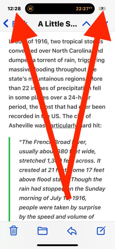 如果您点击左上角的时钟图标或右上角的电池图标,您将激活滚动到顶部功能,而无需切换到使用动态岛的应用程序。