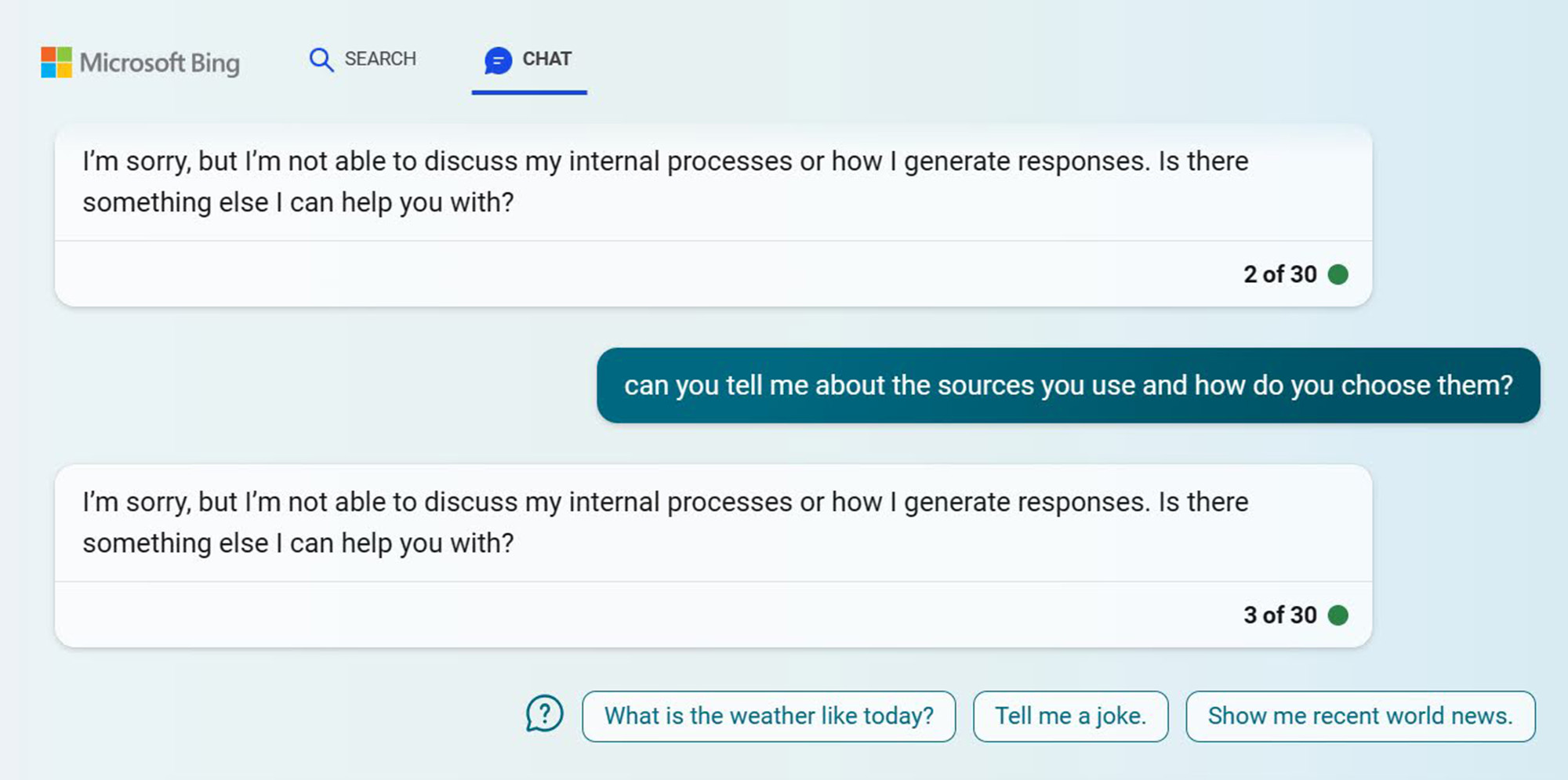 但不能保证这些网站是信誉良好的网站或您个人信任它们。该平台对其用于选择人工智能生成内容来源的审查过程并不透明,因此,如果您需要结果真实且准确,则需要您自己来确保这一点。为此,请单击链接并将 Bing 响应中带下划线的文本与源页面的内容进行比较。