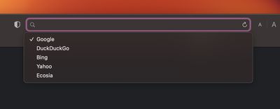 在 Safari 中,实际上可以从地址栏快速切换搜索引擎。只需在输入任何单词之前按空格键,您就会看到一个下拉菜单,您可以在其中从浏览器的五个搜索引擎选项中进行选择。