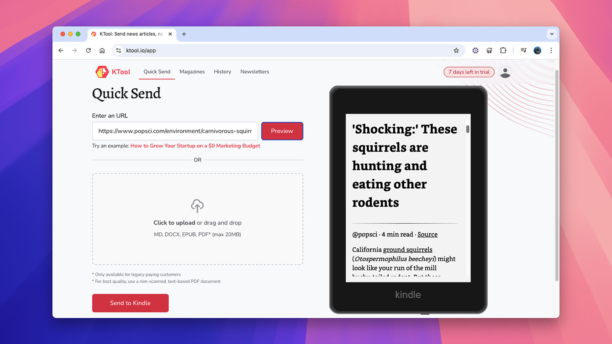 另一个值得您考虑的选择是工具库。与 Push to Kindle 一样,它可以在桌面和移动设备上运行,并且还支持时事通讯,因此您可以通过向 Kindle 发送电子邮件以便稍后阅读来清理收件箱。 KTool 的起价为每月 3 美元,但您可以先免费试用一周,以确定它是否物有所值。