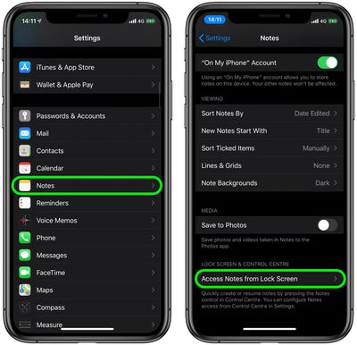 - 向下滚动并点击从锁定屏幕访问笔记。