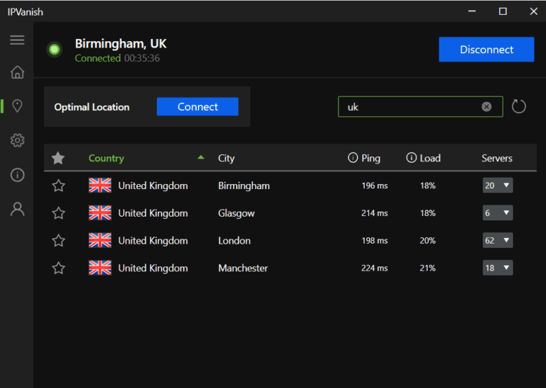 - 启动您的应用程序并连接到 PorkerStars 批准位置的服务器。我选择了工作伯明翰,英国服务器对于这个演示。