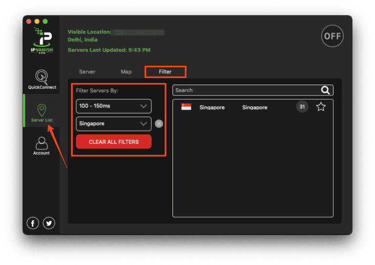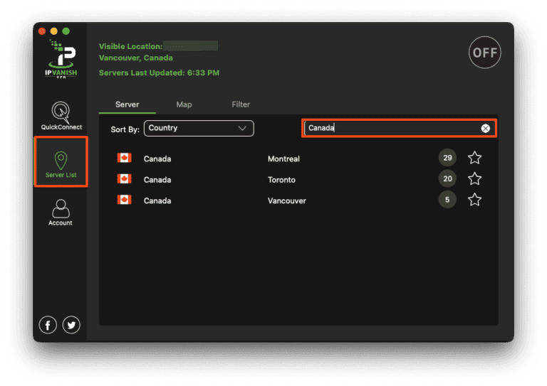 通过导航到发现加拿大最好的 IPVanish 服务器服务器列表,应用一个筛选以获得低延迟,并选择您所需的位置。