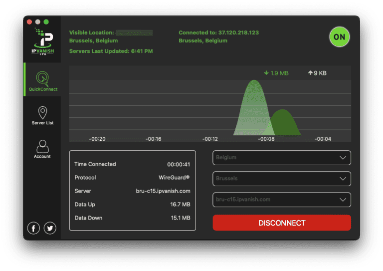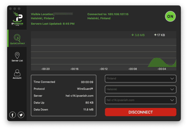 - 在 IPVanish 应用程序中连接到您所需的服务器位置。