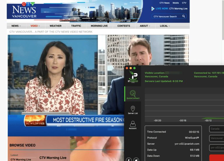 例如,我使用 IPVanish 的蒙特利尔服务器收看当地的 CTV 新闻。