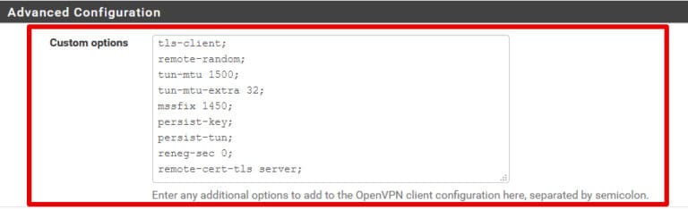 - 选择“OPT1 (ovpnc1)”部分中的“高级配置” 菜单并检查“使能够”。