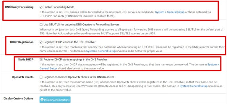 - 查看 ”DNS 查询转发,” “DHCP 注册,” “静态DHCP,“ 和 ”OpenVPN 客户端”。然后,单击“节省”。