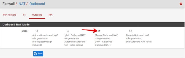 - 选择 ”手动生成出站 NAT 规则”。然后,单击“节省”。
