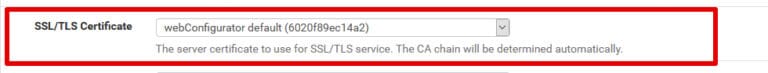 - 单击“SSL/TLS 证书”下拉菜单并选择“webConfigurator 默认 (XXXXXXXXXX)(服务器:是,正在使用)”。