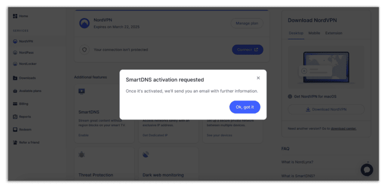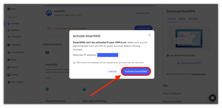 - 您的屏幕上将出现一个新的弹出窗口,显示您的真实 IP 地址。点击“激活智能DNS“ 选项。