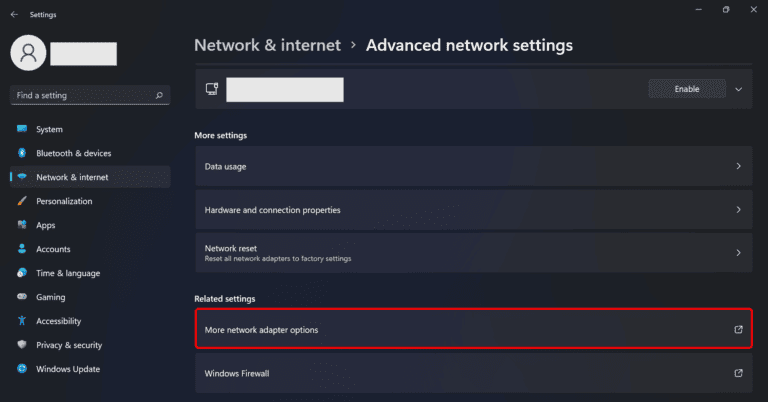 - 向下滚动并选择“更多网络适配器选项”。这会将您重定向到控制面板。