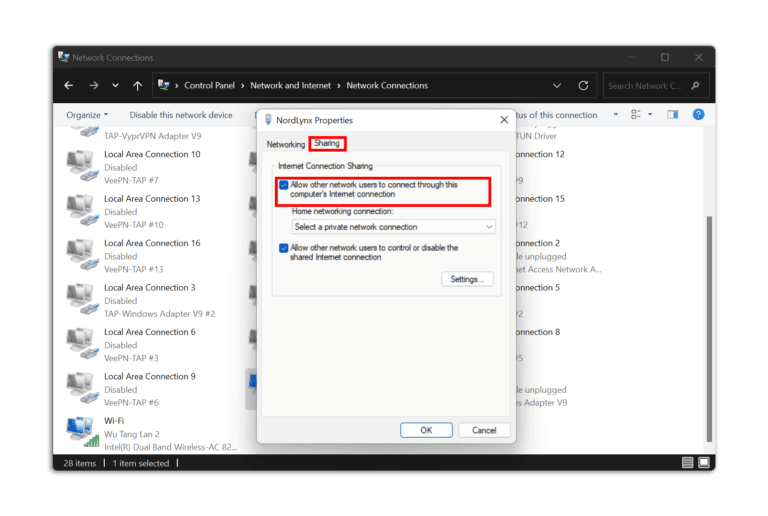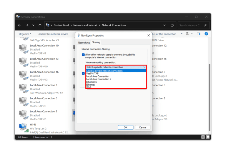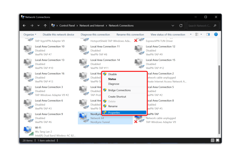 - 进一步向下滚动以找到与 NordVPN 相关的任何内容。这可能会有所不同。就我而言,有一个 NordLynx 连接。右键单击并选择“特性”。