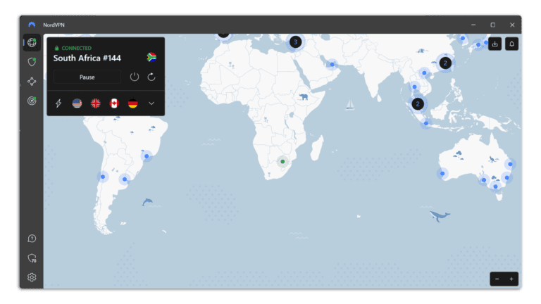 - 从左侧面板中选择连接到您选择的服务器。就我而言,我选择了南非服务器,我能找到的最接近的。