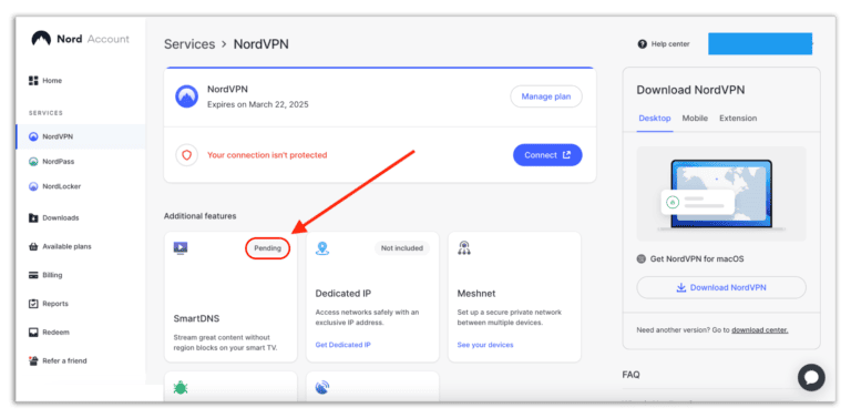 - 单击NordVPN 选项卡在左侧面板上。这将显示 SmartDNS 框。点击“使能够”选项。如果 NordVPN 应用程序已在运行,请将其断开连接。