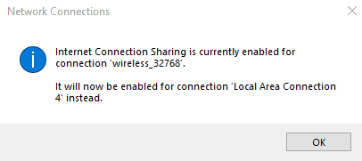 - 弹出消息将通知您“Internet 连接共享当前已启用”用于 PIA 网络连接。单击好的。
