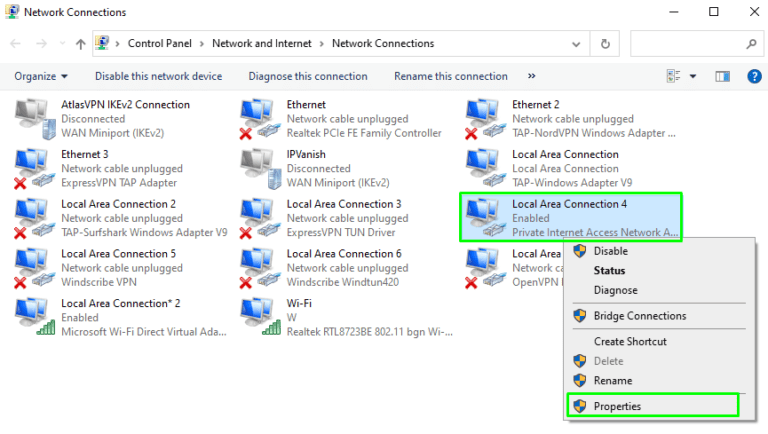 - 右键单击网络连接,使用专用互联网接入网络适配器并选择特性。