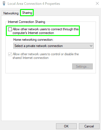 - 单击“分享”选项卡并启用“允许其他网络用户通过此计算机的 Internet 连接进行连接“ 选项。