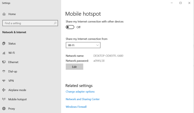 - 在下面 ”与其他设备共享我的互联网连接,”将开关切换到打开位置以激活热点。它将启用您的 PC 的互联网共享。