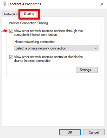 - 将弹出一个新窗口。选择“分享”选项卡并选中第一个选项,“允许其他网络用户通过此计算机的互联网连接进行连接。”从明显的下拉菜单中选择您之前激活的热点连接的名称。
