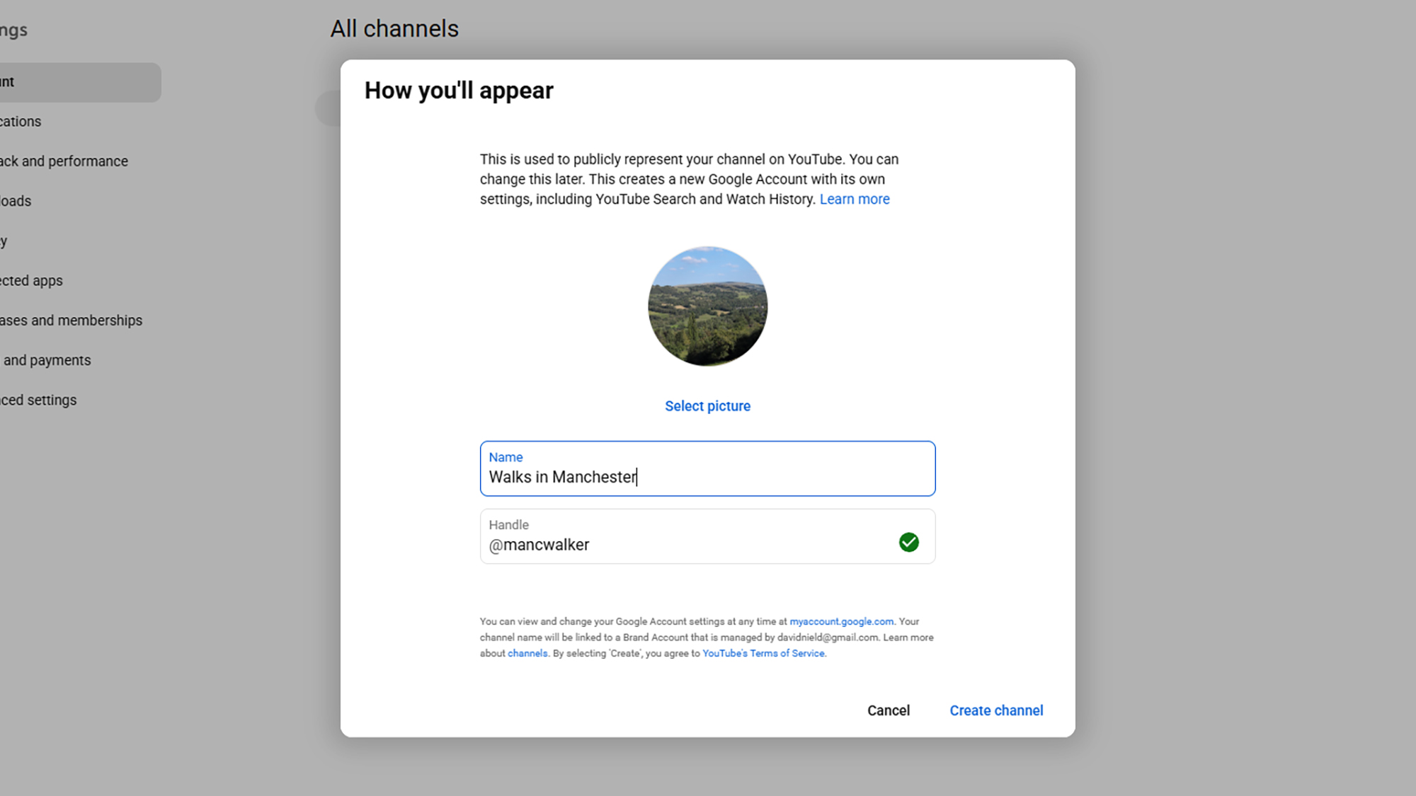 您已创建的所有频道以及您的主频道都会显示。点击创建频道制作一个新的,然后给它一个名称和一张图片,并选择一个句柄——显然它需要是平台上尚未采用的唯一的东西。点击创建频道,你就完成了。