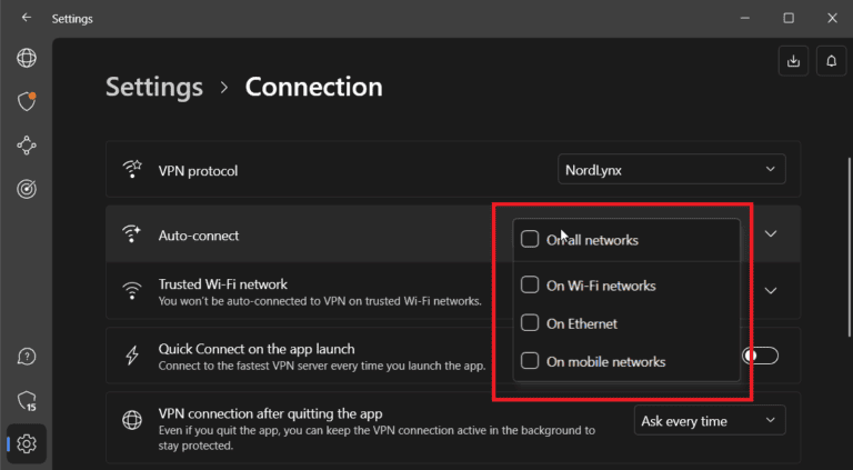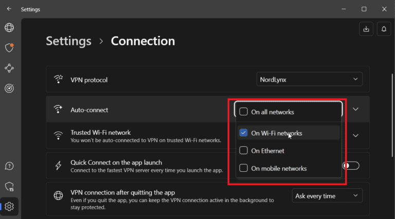 - 选择您希望 NordVPN 自动连接的网络类型。我会选择“在 Wi-Fi 网络上”对于这次演示。
