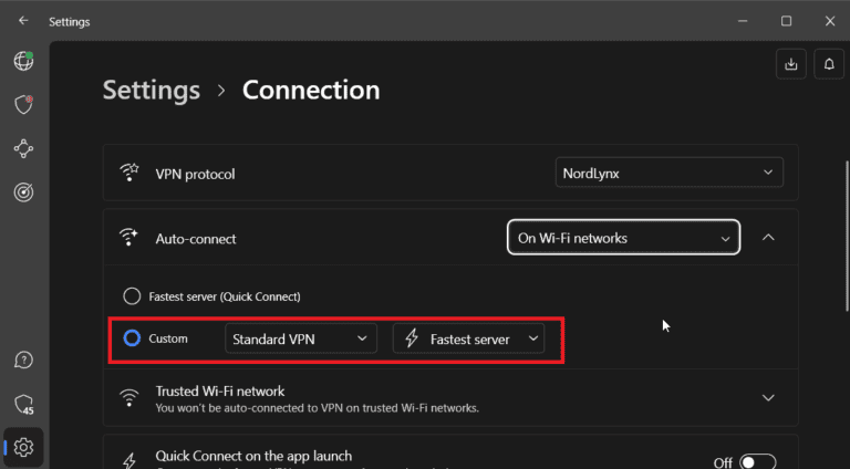 NordVPN 可以配置为在启动应用程序后自动连接到任何服务器。这可能是当您在设备启动时自动启动应用程序或稍后手动启动应用程序时。