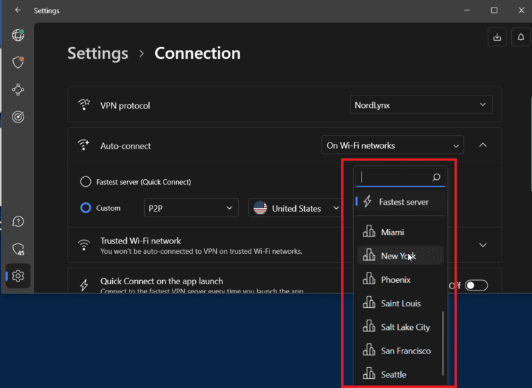 - 如果所选位置有城市服务器(例如美国),您可以选择一个城市或让 NordVPN 选择最快的城市。
