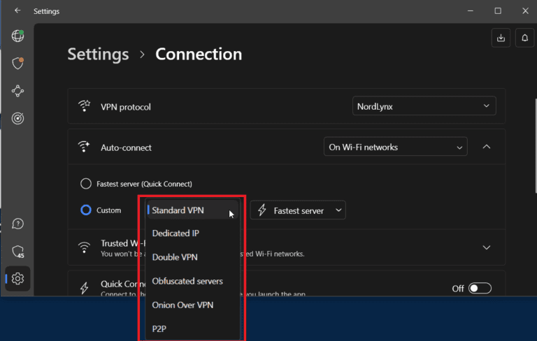 - 将选择保留为“最快的服务器”以允许 NordVPN 选择您所选类别中最快的服务器类型。