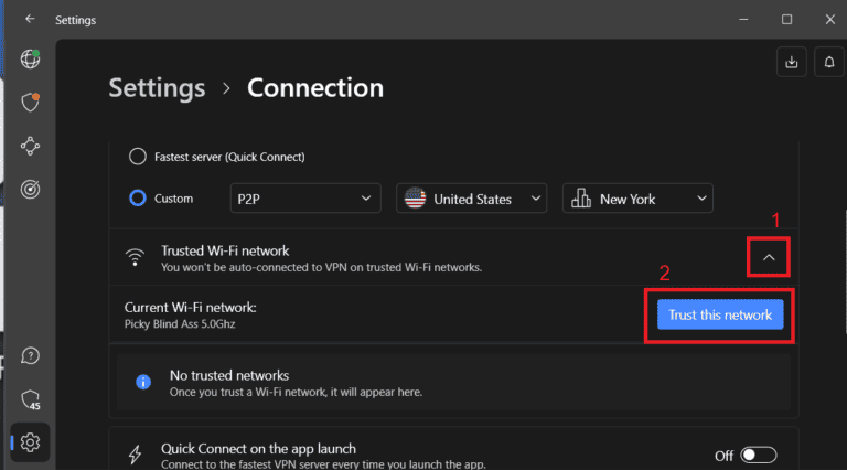 - 返回 NordVPN 应用程序。然后,单击“”之前的下拉菜单值得信赖的 Wi-Fi 网络”。