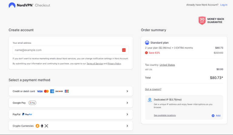 - 通过填写来设置您的 NordVPN 帐户您的电子邮件地址并选择一个合适的付款方式。付款。