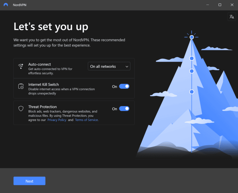 - 打开 NordVPN 应用程序并优化您的初始设置。保持互联网终止开关和威胁防护以获得更好的安全性。您还可以保留自动连接已启用。