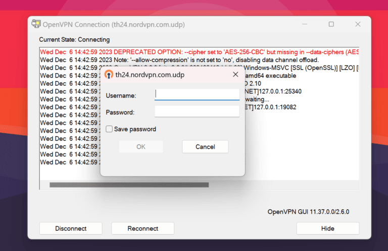 - 将复制的 NordVPN 凭据输入 OpenVPN GUI 字段,然后单击“好的”。