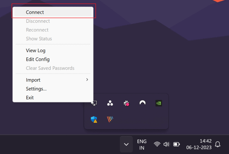 - 打开 Windows 11 时钟旁边的系统托盘,右键单击 OpenVPN GUI 应用程序,然后单击“连接”。